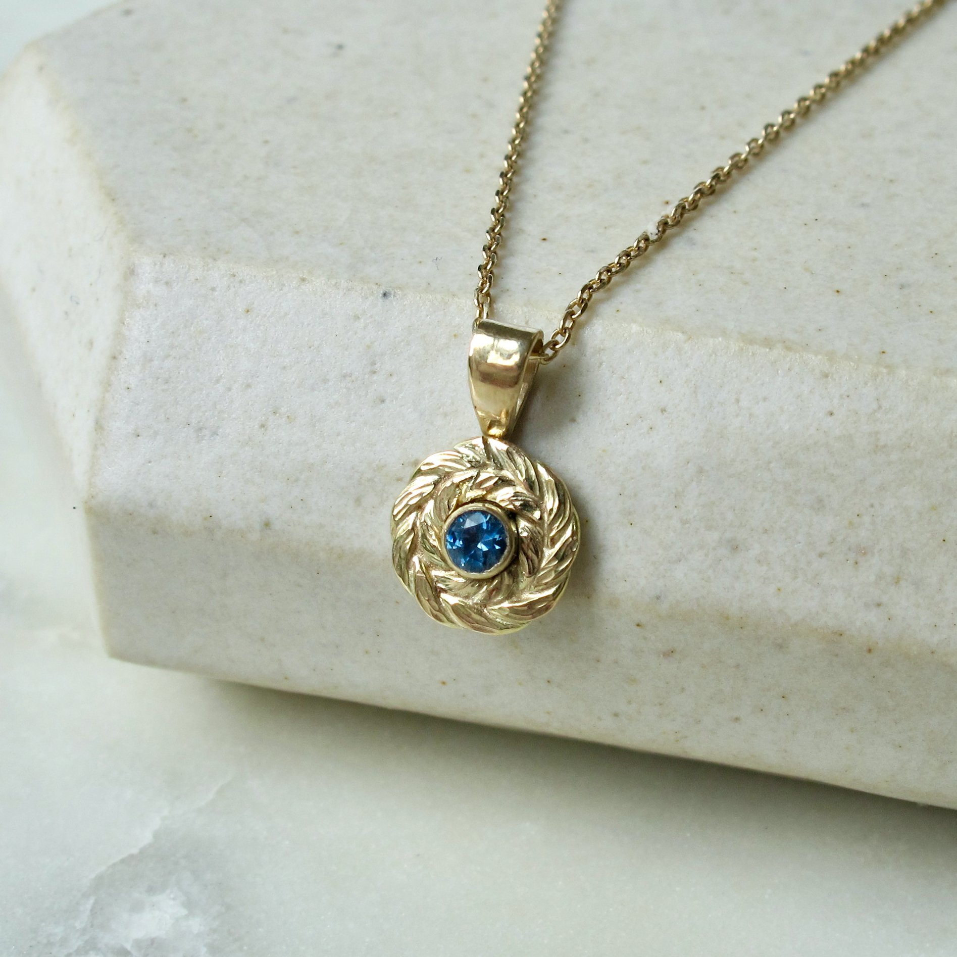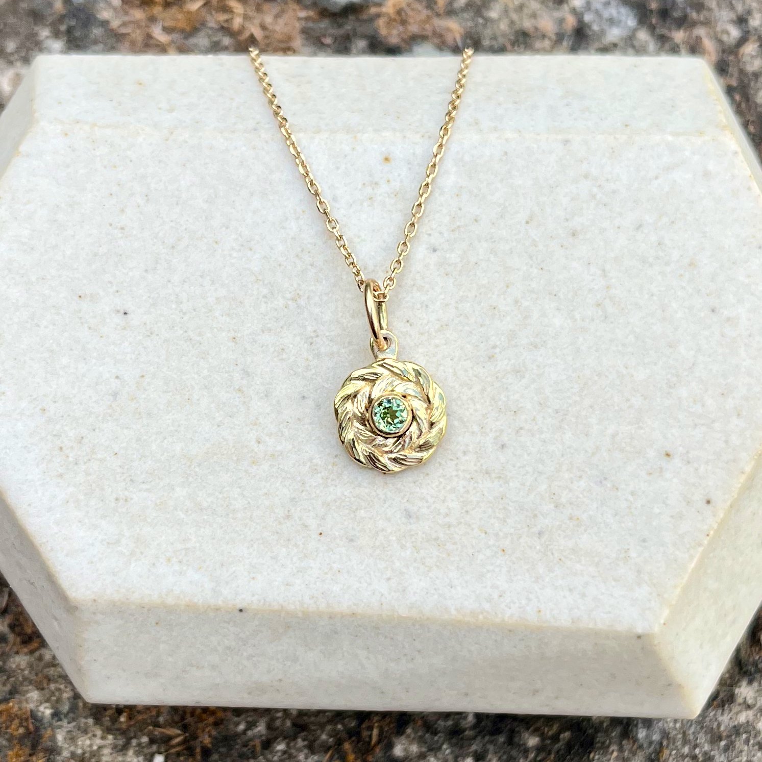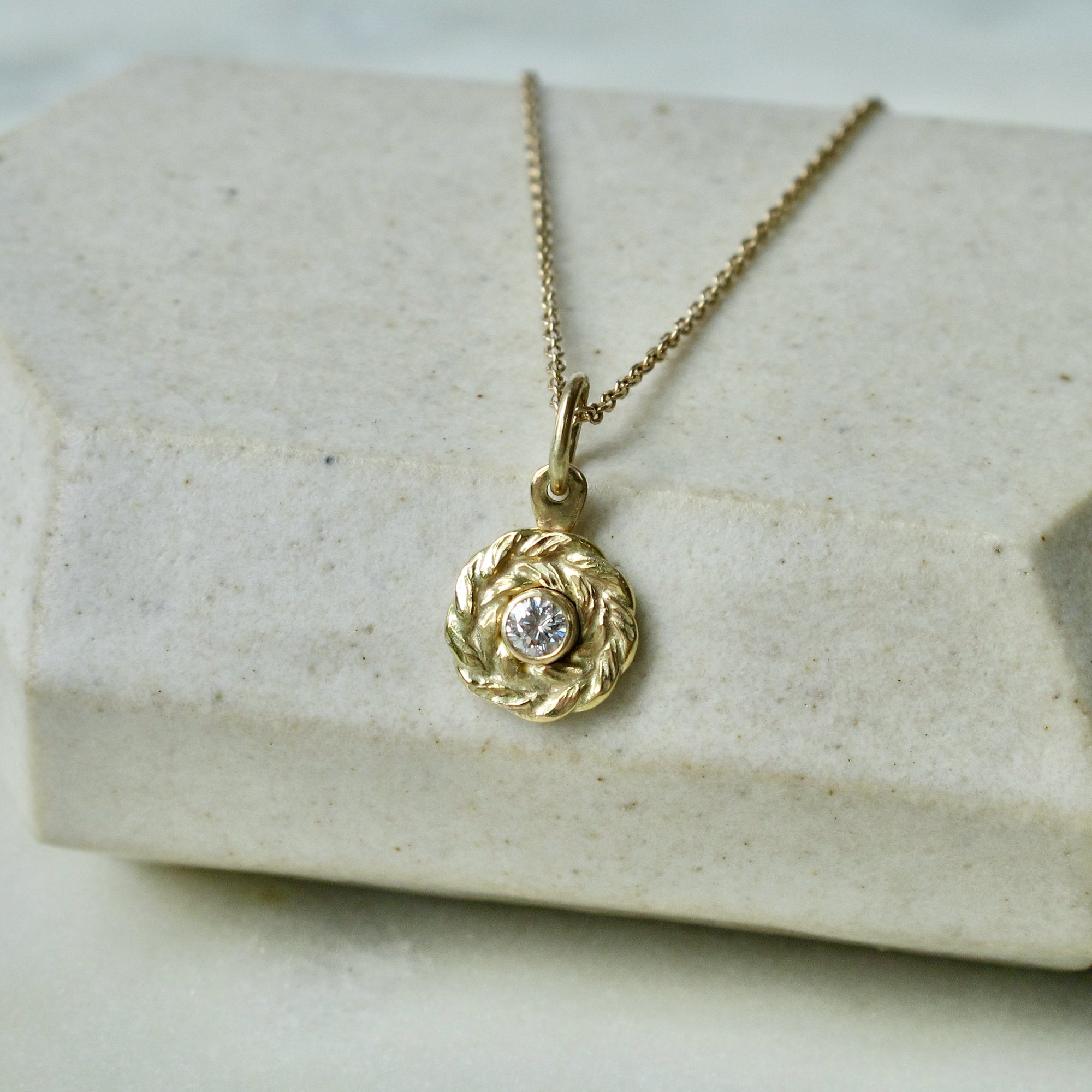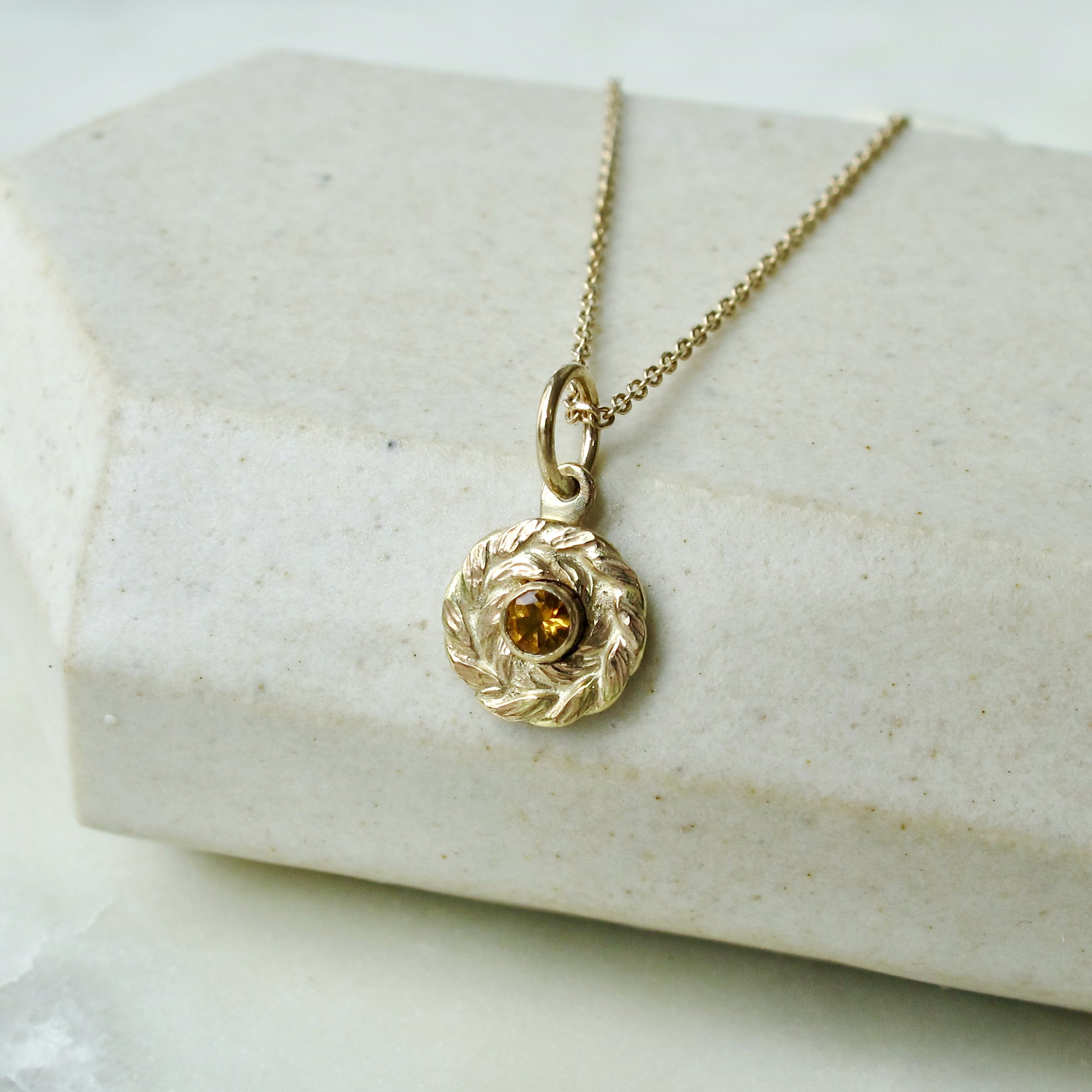 New to the lineup: a wee version of the wreath charm featuring your choice of birthstone and bail style! Featuring a hand-forged laurel wreath encircling a vibrant bezel-set gemstone.