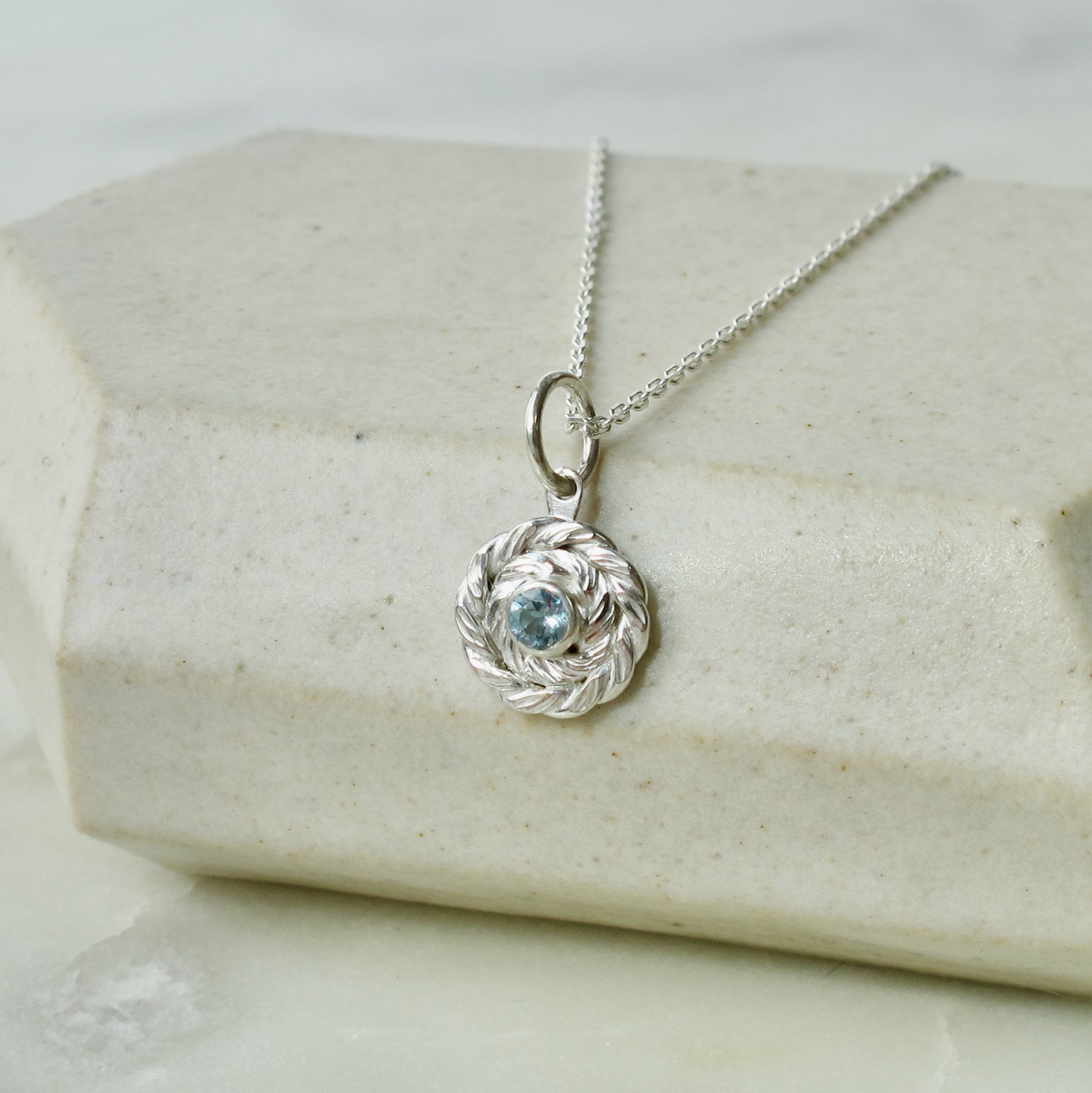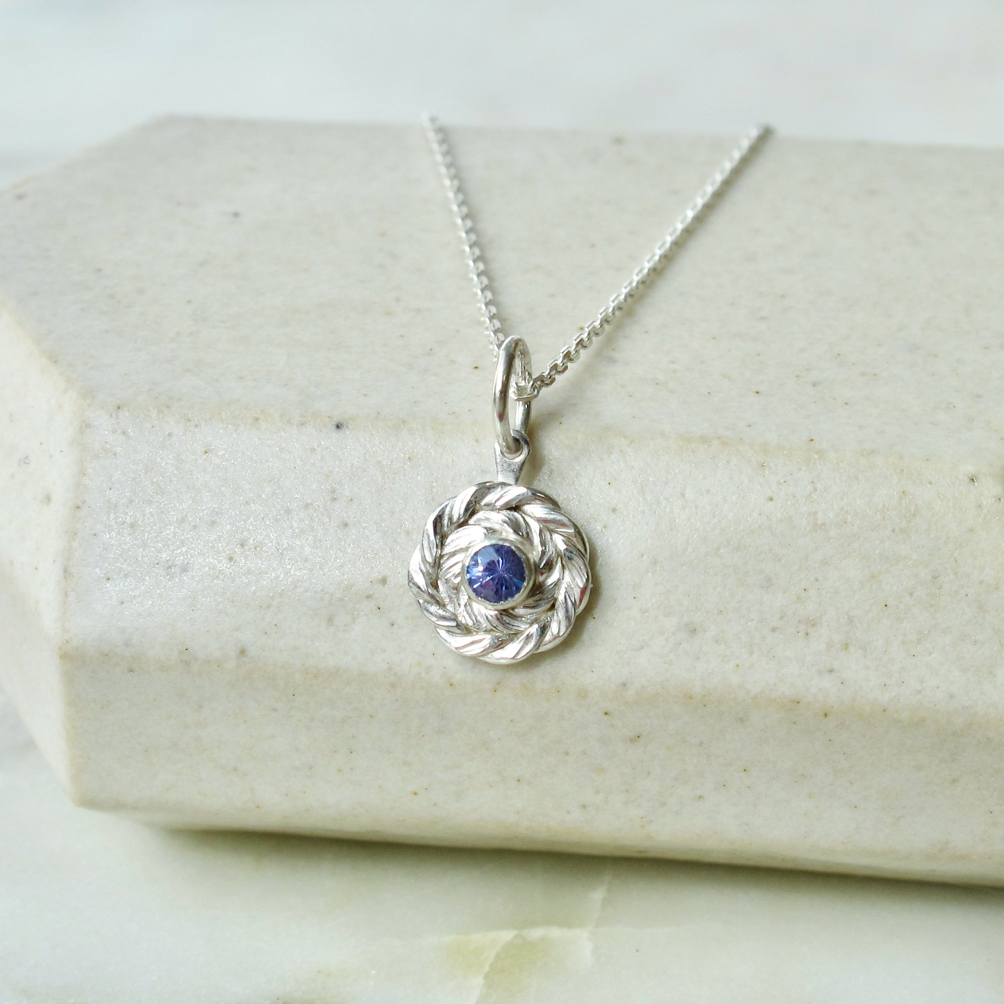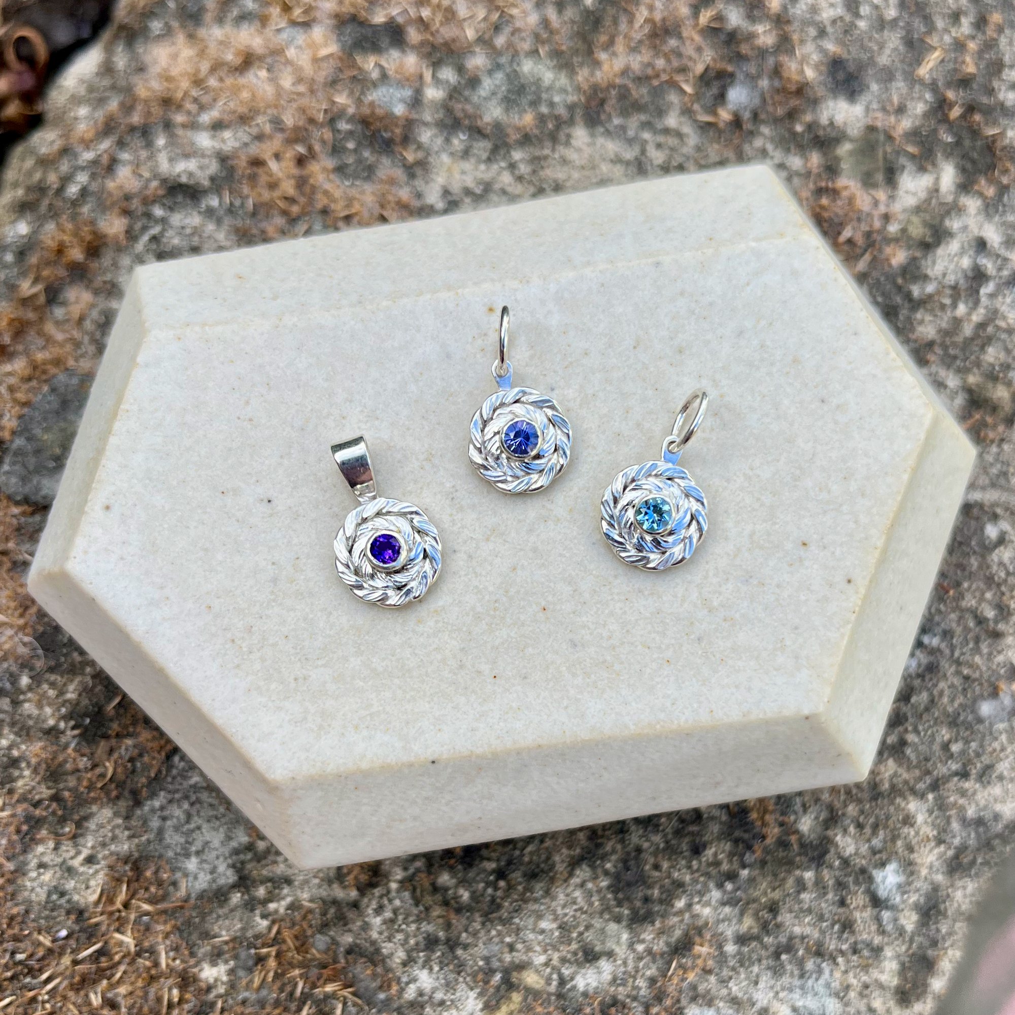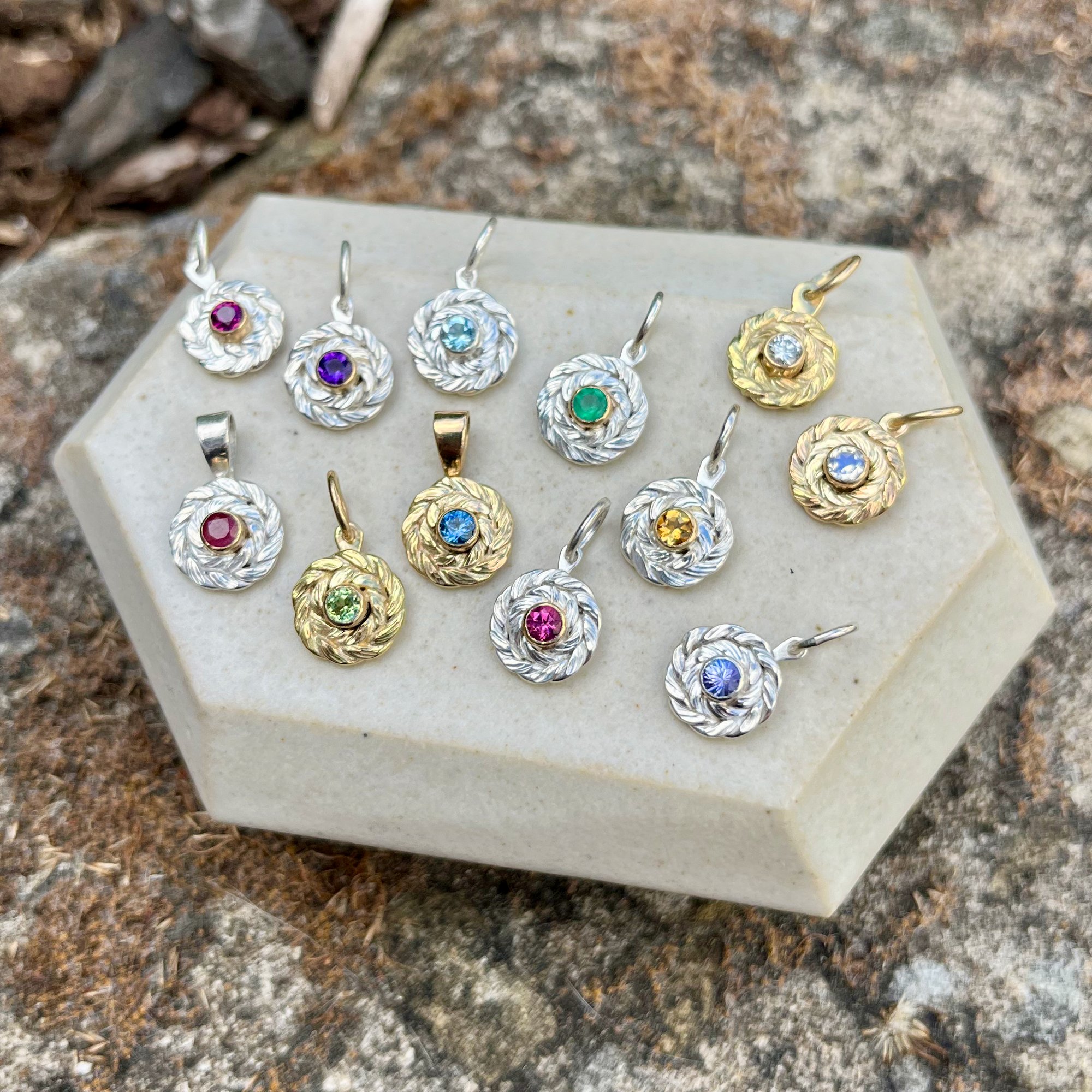 New to the lineup: a wee version of the wreath charm featuring your choice of birthstone and bail style! Featuring a hand-forged laurel wreath encircling a vibrant bezel-set gemstone.