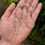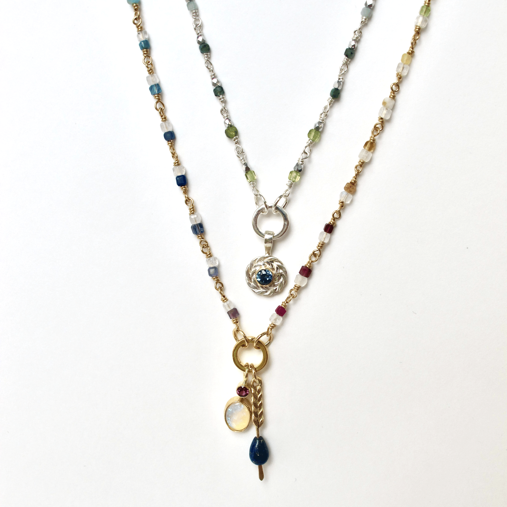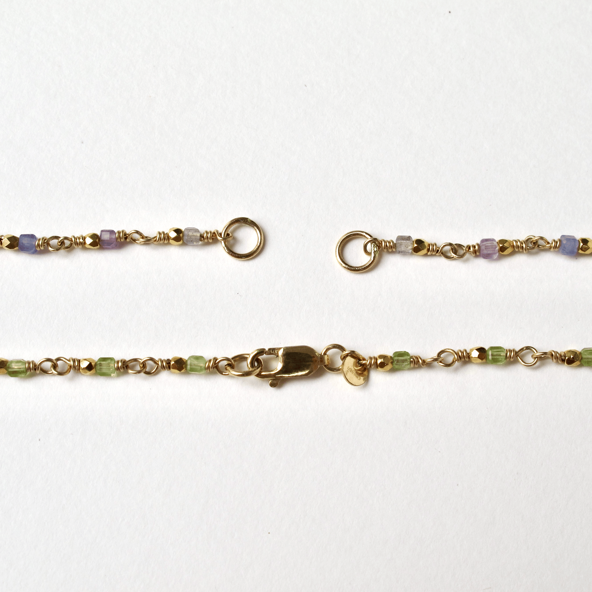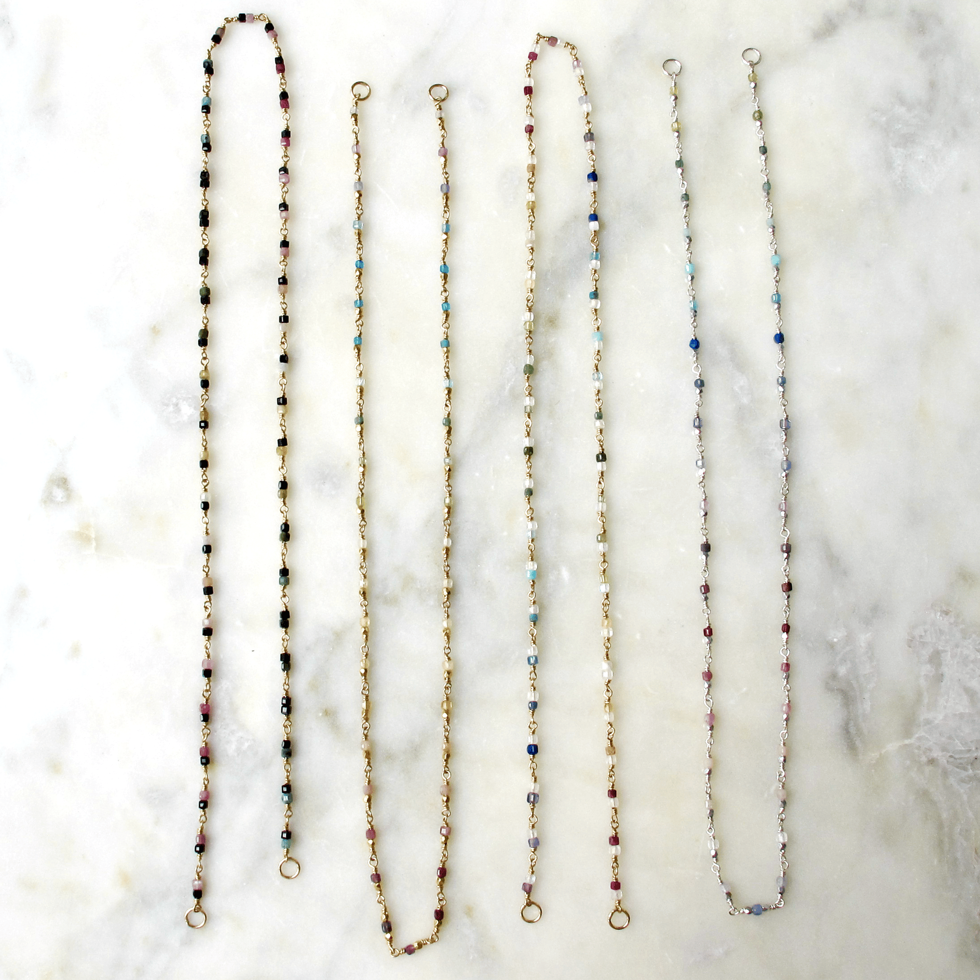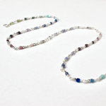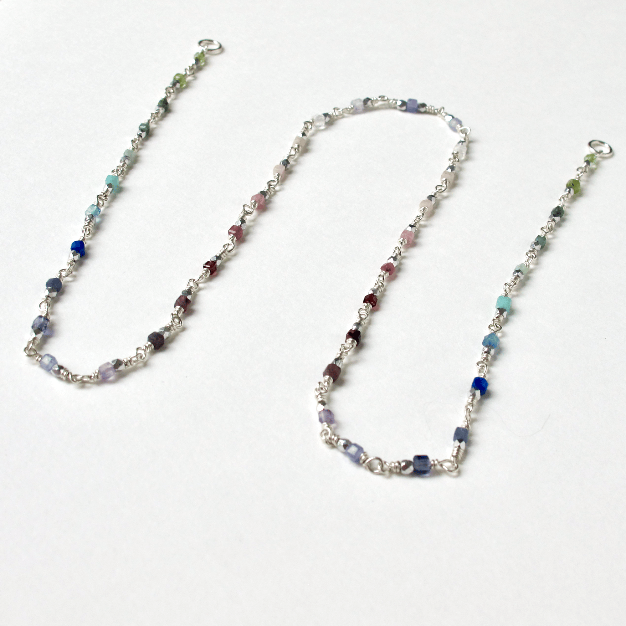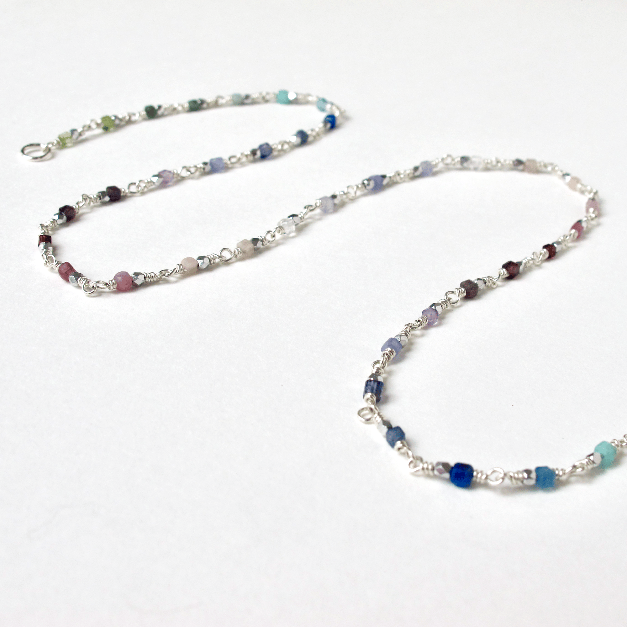 The rainbow gemstone chain celebrates the beautiful diversity of colors found in nature. Featuring cool-toned greens, blues, purples, and pinks, linked together with sparkling silver plated beads and sterling silver wire.